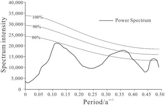 In this study, the red fit (red noise) method was used to analyze the annual rainfall periods in the YRB. A discrete AR1 process r for times ti (i = 1, 2, …, N) with arbitrary spacing is given by Robinson 1977 [21]: