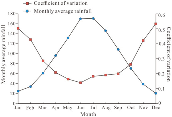 Monthly average rainfall and its coefficient of variation in the YRB.
