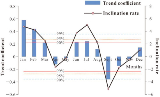 Trends in the interannual variability of the monthly rainfall and climate inclination rate in the YRB in the 50-year period.