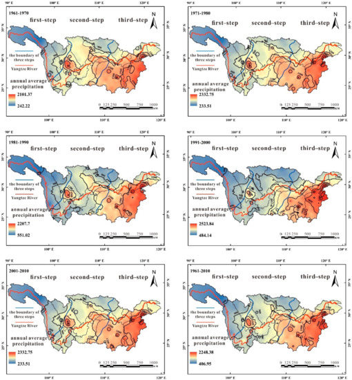 In the 50-year period, the interdecadal changes in the 900 and 1200 mm iso-rainfall lines were not obvious in the entire YRB. As for the 1980s, the 1200 mm iso-rainfall line in the upper and middle basin of the Yangtze River—especially the Sichuan Basin—showed a great change, and it extended from the northeast of the Sichuan basin to the upper basin of the Jialing River. The range of the 1500 mm iso-rainfall line varied significantly in the middle and lower basin during the study period. It appeared in Jiangxi and Anhui Provinces from the 1960s to the 1980s, and the area extended to the central part of Hunan Province in the 1990s. In the 21st century, however, the area with 1500 mm rainfall returned to its original state from the 1960s. Furthermore, there were few areas in the YRB with an annual rainfall greater than 1800 mm. However, these areas expanded after the 1990s. In particular, the annual rainfall of Huangshan in Anhui Province and Dexing in Jiangxi Province was higher than 2100 mm, which indirectly induced the flood disasters that occurred in 1998 and 1999 [24].