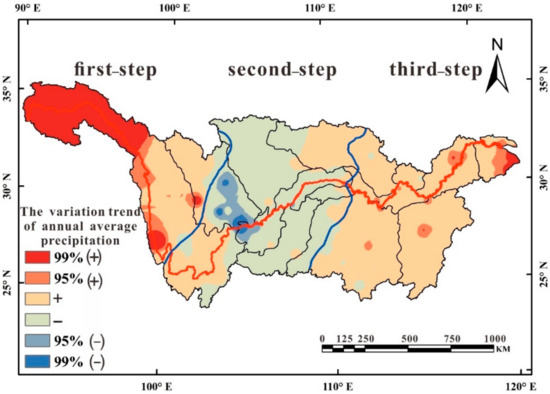By using the Mann–Kendall trend test, we observed that the annual rainfall in the YRB presented an “increase–decrease–increase” trend from east to west (Figure 7). Our results show that the annual rainfall increased in the first and the third topographic steps; the areas with increasing annual rainfall included the Yunnan–Guizhou Plateau in the southeast of the Qinghai–Tibet Plateau and the west of the Nanyang Basin. The annual rainfall in the eastern part of the Taihu Lake Basin and the upper basin of the Jinsha River Basin showed an increasing trend (passing the 0.05 significance test). On the other hand, the areas with annual rainfall reductions were all located in the second topographic steps, which were mainly concentrated in the border area of the Qinghai–Tibet Plateau, Yunnan–Guizhou Plateau, and Sichuan Basin (passing the 0.05 significance test).