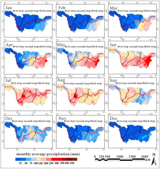Spatial distribution of the monthly average rainfall in the YRB from 1961 to 2010.