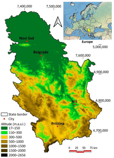 Serbia is a country in the Balkan Peninsula and belongs to South-East Europe, with the area of 88,361 km2. The capital is Belgrade and large cities are Niš, Novi Sad, and Priština. Serbia is divided into four geotectonic units, namely the Pannonian Basin, the Dinarides, Serbian-macedonian massif, the Carpatho-balkanides. The morphology of the terrain is heterogeneous, with the lowest point of 17 m near the Danube river and the highest point of 2656 m on Mountain Djeravica (see Figure 1). The study area covers the whole territory of Serbia with the geographical coordinates 41°53′ N–46°11′ N; 18°49′ E–23° E). According to the last census in 2011, Serbia has 7,234,000 citizens.