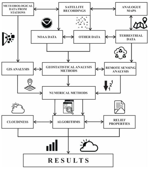 This function has enough accuracy to analyze cloud cover from the grid. The satellite recording data were downloaded from the official web page of MODIS (Moderate Resolution Imaging Spectroradiometer; https://modis.gsfc.nasa.gov/gallery/, accessed on 2 April 2021). To measure the areas with cloud cover, we used processes of vectorization and digitization. The ordinary kriging and semi-kriging methods were used in the calculations because they include autocorrelation or the statistical relationship among the measured points. All data were presented in a raster format. The main meteorological data are presented in grid with an average resolution of 500 m2. The first are the maps that present the average cloud cover through the months. The second are the maps that present the average seasonal cloud cover. The third are the maps that present the absolute cloud cover. All of the maps presented the cloud cover in a percentage. Low cloudiness has values between 0% and 25%. Medium cloudiness has values between 25% and 50%. High cloudiness has values between 50% and 75%. Very high cloudiness has values between 75% and 100%. Excluding the average cloudiness that was downloaded from the satellite, the seasonal and absolute cloudiness were derived using special algorithms such as zonal statistics and kernel. With the use of the kernel density distribution, the resolution was much higher and was around 50 m. In this way, the maps covered 50 m2 of the sky and were useful for precise and significant calculations. In order to obtain the results of the cloud cover distribution, pixel and swapping pixel analysis were used. Relative cloudiness for a thirty year’ period was derived from the combination of cloud layers each month within the period between 1989–2019. For each month, the daily average cloudiness on the territory of the country was used. The border of the territory was cropped by means of QGIS. For each month, the day with the highest cloudiness was used too. The raster data were vectorized and transformed into precise cells with geographic coordinates. In order to perform a precise GIS analysis, highly sophisticated types of software were used that had the possibility of performing a complete numerical analysis of relief. There are many models that can display both qualitative and quantitative values of the relief. A special algorithm that may be successfully used in numerical analysis is the hybrid support vector regression (SVR) supported by machine learning methods (MLM). For the purpose of determining the characteristics of relief and cloudiness as a meteorological phenomenon more precisely, it is necessary to implement certain statistical algorithms within the GIS system [56]. Apart from the standard kernel analysis, which is suitable for determining the points of distribution, specific GIS methodologies and algorithms were used in this research. The basic algorithms used for a better analysis of the distribution and frequency of clouds were the interpolation method and inverse distance weight (IDW) method. The interpolation method was used for the overlap and the analysis of the dotted grid in different resolutions. The specific interpolation methods that we used were triangulated irregular network (TIN) or Delaunay triangulation. The spatial algorithm is one of the advanced ones, which conducts a spatial analysis of dots [57,58,59]. It gives excellent results when combined with other spatial algorithms. All of the methods of interpolation were used with the help of open source software Quantum Geographical Information System (QGIS 3.12) and System for Automated Geoscientific Analysis (SAGA).