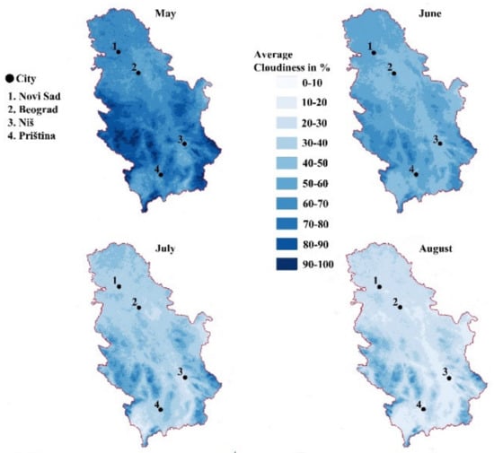 June, as the first summer month, had much less cloudiness than the winter and spring months. There was no belt of maximum cloudiness of 90–100%. The average cloudiness in June was at maximum values of 70–80%. The belt matched the belts of the maximum cloudiness from the previous months, and was therefore pronounced in the west and in the east of the country and in Kosovo. July, unlike June, had maximum cloudiness areas of 90–100% in the Stara mountain and partly in Mokra Gora in Kosovo. The total maximum cloudiness area comprised 360 km2. The distribution of cloudiness was identical to June. In August, the area of maximum cloudiness comprised an area of 267.5 km2. Maximum cloudiness was distributed over the Stara mountain and partly over the mountain Šara (see Figure 5).