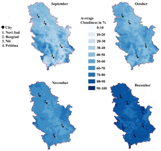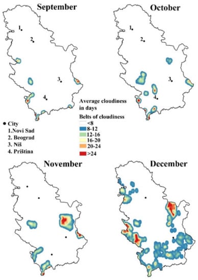 September, as the first autumn month, had cloudiness higher than all of the summer months. Maximum cloudiness in % was distributed in the North-Eastern slopes of the Stara mountain, and in the East and the West of Kosovo in the mountains Šar, Mokra Gora. The total area of maximum cloudiness was 856.2 km2. In October, cloudiness was higher than in September, and it also had a different distribution. Maximum cloudiness of 90–100% was distributed in the east of the country, in the vicinity of Danube, and partly in the Stara mountain. There was also a belt in the south of Kosovo and a part in The Pester plateau. The total area of maximum cloudiness was 902.3 km2.The total area of maximum cloudiness of 90–100% in November comprised an area of 1345.1 km2. The areas were distributed in the Stara mountain; the Pešter plateau; partly in Central Serbia; and in the north, east, and south part of Kosovo (see Figure 5).