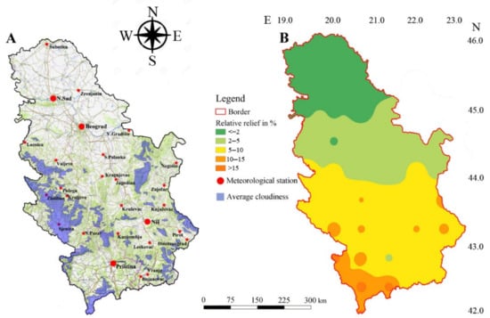 (A) Areas with high cloudiness in the last thirty years (1989–2019). (B) Terrain relative relief of Serbia from the North to the East.
