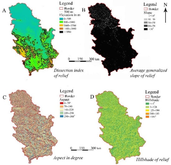 Analysis of the terrain in Serbia in four areas: (A) dissection index of relief; (B) slope of relief; (C) aspect of relief; (D) hillshade of relief.