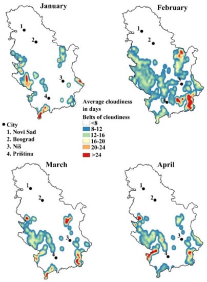 Average distribution of cloudiness (January, February, March, and April) in the territory of Serbia per day for the period of 1989–2019.