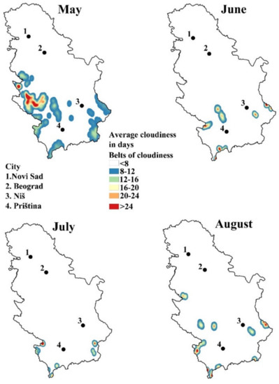 In April, the highest cloudiness of 90–100% covered an area of 2330 km2. This was characterized by the areas in the Eastern parts of the country, in the vicinity of Timok, Pek, and partly Danube. Western Serbia was also covered by clouds in the mountains of Golija, Maljen, and Suvobor. In Kosovo, the areas covered were in the West and in the South. Eastern Serbia had a lot of territories with a maximum cloudiness, most of them being in the Stara mountain. May is a spring month, with the cloudiness being higher than for any other spring month, and the areas with a maximum cloudiness comprised 2560.6 km2. This degree of cloudiness is distributed in the west of Serbia, towards the Drina river, in central Serbia, in some parts of Šumadija, towards the mountains Kopaonik, Goč, Željin. In Eastern Serbia, cloudiness spread over the Suva and Stara mountain; further in the west parts of Kosovo in Mokra Gora; in the south; and on the mountains Prokletije, Šara, Paštrik, and Koritnik (Figure 4).