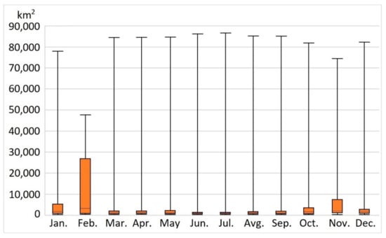The analysis of the synoptic data of the relative cloudiness in %, which was downloaded from the MODIS satellite and later digitized and vectorized within GIS software, produced the following results. December was the first winter month and had the highest cloudiness between with 90–100% and a territory of 1867.5 km2. The highest cloudiness was distributed in Eastern Serbia, then more to the north in the vicinity of the Danube river, a part of Western Serbia, South-East Kosovo, and South-East Serbia. The cloudiness covered more than 70% of the area at an elevation higher than 700 m. According to Figure 3, February was the month with the highest cloudiness in the winter season. January covered an area of 1456.4 km2 with the maximum cloudiness from 9–100%. Within the last 30 years, the highest cloudiness in this month was in the far East, West, and South-West Serbia, where 80% of these territories occupy elevations higher than 1000 m. In February, the class of 90–100% covered the area of 3856.5 km2 or 4.36% of the territory of the country. Unlike in January, in February, cloudiness did not only cover the areas at the highest elevations. The distribution of territories was identical to those in January, the difference being the northern and eastern parts of the Province of Kosovo, the whole of West Serbia, and a part of Central Serbia, as well as the Pester plateau. March, being the first spring month, had very similar areas of cloudiness like January (Figure 3). The territories were distributed in Western, Eastern, and South-East Serbia, and in the South of Kosovo. A part of the territories with the highest cloudiness was located in Central Serbia. The cloudiness covered somewhat lower elevations, between 300–500 m. The total area of the maximum cloudiness of 90–100% was 2102 km2.