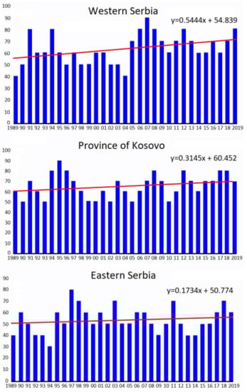 In this test, two hypotheses were tested: the zero hypothesis shows the inexistence of a trend in a time series, and the alternative hypothesis () shows the existence of a statistically significant trend in the time series for the chosen level of significance (). The value of p determines the accuracy of the hypothesis. If the value of p is lower than the chosen level of significance (it is common that = 0.05 or 5% rare 0.01 or 1%), hypothesis should be rejected and hypothesis should be accepted [62,63]. The purpose of this test is to test the data on cloudiness in (%) for the period (1989–2019) in five regions in Serbia, namely the Province of Vojvodina, Central Serbia, Western Serbia, Eastern Serbia, and the Province of Kosovo. The absolute cloudiness per month in the regions of central Serbia and the Province of Vojvodina is mostly <8 days.