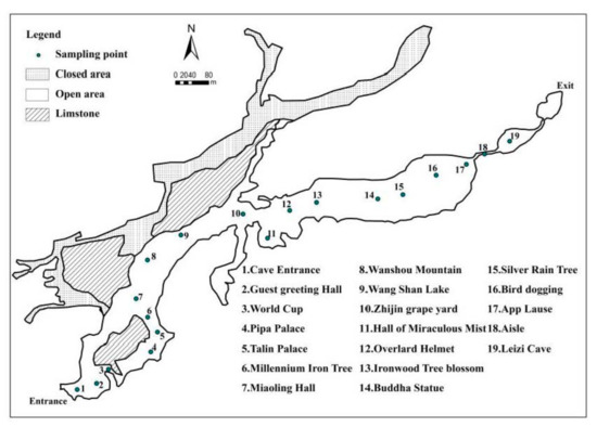 - Pan, Y.X.; Zhou, Z.F.; Zhang, J.; Wang, Y.L.; Tian, Z.H. Temporal and spatial distribution characteristics of microclimate environmental elements in Karst tourism caves—A case study of Zhijin cave in Guizhou province. Sci. Technol. Eng. 2018, 18, 20–30. [Google Scholar]