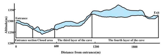 Zhijindong Cave (26°38’31″ N~26°52′35″ N, 105°44′42″ E~106°11′38″ E) is located in Zhijin County in the karst area of southwest China. This area belongs to the subtropical region of China, and the climate type is the subtropical monsoon climate, the annual average temperature is 14.7 °C, the annual average precipitation is about 1400–1500 mm, the local vegetation type is mainly subtropical evergreen broad-leaved forest [28]. The cave is developed in the limestone strata of Huangchunba member (T1y2) and Yongningzhen formation (T1yn) in Yelang formation (T1y) of Lower Triassic [29]. It is composed of two main caves and four branch caves with a total length of 12.1 km and a total of 47 halls, which can be divided into four layers from bottom to top (Figure 1 and Figure 2). The first layer is in the bottom of the cave, connecting to the underground river, and the second layer is the unopened section. The open section is 3.4 km long, which is mainly located on the third and fourth floors, with a total area about 780,000 m2 and a total volume about 6 million m3. The highest part of the tunnel is 78 m, the widest part is 175 m, and the relative height difference is 150 m.