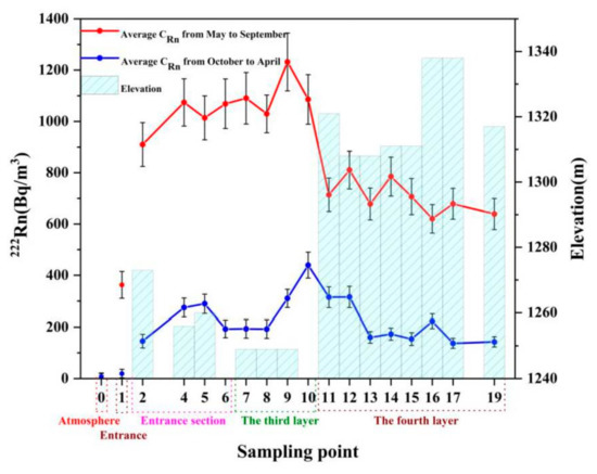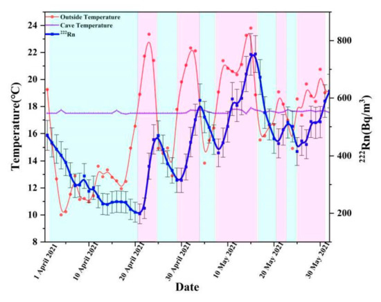 Radon in the natural environment mainly comes from the release of rock and soil, and the concentration difference is obvious in different regions (different background values of uranium and radium) and different environments (outdoor, basement, indoor, cave, and mine). Especially, local radiation which is much higher than natural background radon radiation (1.2 mSv/a) has been found in Yangjiang (China), Guarapari (Brazil), Kerala (India), and Lamsal (Iran) [2,3,4]. Radon concentration in the open atmosphere generally ranges from a few Bq/m3 to more than a dozen Bq/m3 [5,6], while in indoors and basements can reach thousands of Bq/m3 [7]. Radon concentrations can reach hundreds of thousands of Bq/m3 in some cave environments [8,9]. Although the content of uranium in limestone is low, carbonates are prone to uranium enrichment during weathering [10], which can resulting in higher radon concentrations in caves in many karst regions of the world [11,12,13,14].The concentration of radon in karst cave air depends on the complex interaction of several different factors, including the internal and external temperature difference, the mixing degree of external air and cave air, the internal humidity of the cave, precipitation and its infiltration into the cave environment, the content of 226Ra in rock strata and cave sediments, the porosity of rock and cave sediments, and the volume and shape of the cave [15,16]. Among them, the cave ventilation caused by meteorological conditions is considered to be the biggest influencing factor [9].