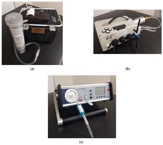 In the present study, an electrostatic collection radon–thoron monitor (RAD7 (SN3154), Durridge Inc., Billerica, MA, USA) [18], a scintillation-cell-type radon and thoron monitor (Radon Mapper, Mi.am Srl, Piacenza, Italy) [19], and an ionizing-chamber-type radon and thoron monitor (AlphaGUARD, DF2000, Saphymo, Frankfurt, Germany) [20] were used for the performance test, as shown in Figure 1.
