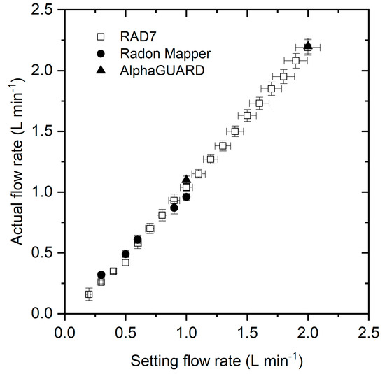 In the measurement of the radon and thoron exhalation rate, the flow rate must be as low as possible because the pumping effect would occur depending on the pressure difference between in-air and in the accumulation chamber [32]. The results show that the lower flow rate could lead to an incorrect result; for example, in case of the RAD7, the estimated thoron concentration at 0.2 L min−1 could be five times higher than that measured at the default flow rate (approximately 0.65 L min−1) [21].