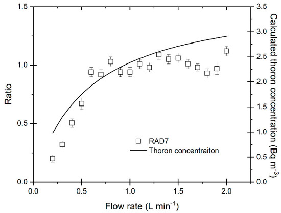 The relationship between the calculated thoron concentration and the ratio with flow rate is shown in Figure 5. The thoron concentration was calculated assuming C0 is 1 m−3, V is 7.5 × 10−2 m3, and λ is 1.2 × 10−4 s−1. There was a difference between tendencies of the ratio and the calculated thoron concentration at high flow rate. This may be because of the relative counting efficiency depending on the flow rate [22,26]. If the flow rate increases, the relative efficiency decreases since some of radon, thoron, and their progenies would escape before being counted. Thus, a magnitude of increase of the calculated thoron concentration at the range of high flow rate could become lower by the correction of the relative counting efficiency. It indicates good agreement of the tendencies of the ratio and the thoron concentration. This would be the reason for the ratio characteristics for the RAD7.