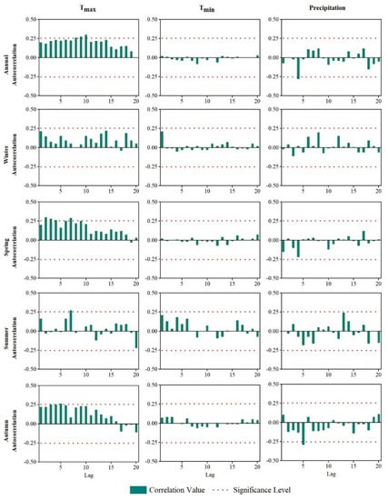 Autocorrelation method is a very valuable tool in the study of a climatological time series []. Prior to running a pattern evaluation, the time series of Tmax, Tmin and precipitation data must be checked for autocorrelation []. The findings may be greatly changed by the use of nonparametric tests to identify patterns. Both Tmax, Tmin and precipitation time series data were then first checked for the presence of an autocorrelation coefficient []. The autocorrelation coefficient value was evaluated at a 95% confidence interval against the null hypothesis, using a two-tailed test. Tmax, Tmin and precipitation time series data were then first checked for the presence of an autocorrelation coefficient (r1) at a 5% significance level using a two-tailed test [].