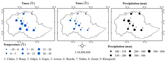 Monthly Tmax, Tmin and precipitation data of 9 meteorological stations were collected from Pakistan Meteorological Department (PMD) and Water and Power Development Authority (WAPDA) (Table 1). The spatial distribution of meteorological stations is displayed in Figure 1. Out of the nine stations, three locates were in high-altitude (>2800 m), these stations were installed by WAPDA in 1995, and the data are available from the period 1995–2012. These stations installed by WAPDA are automated weather stations, known as data collection platform (DCPs), that measure snow in millimeters of the water equivalent []. The remaining six stations were in the elevation of 1250–2210 m and the time period in these stations was from 1955 to 2016. Climate data before 1955 was missing values in the six stations; therefore, we used the data from 1955 onwards which had no missing values. The authors of Ref. [] and Ref. [] also used data from 1960 onwards due to these inconsistencies. However, there were no missing values in the data of three high-altitude climate stations from 1995 to 2012 []. The seasons were classified as follows: winter (December, January, February); spring (March, April, May); summer (June, July, August) and autumn (September, October, November). The regional mean Tmax, Tmin and precipitation of annual and seasonal time series were calculated by taking the average values of all stations. For regional means, only six stations with data from 1960 to 2016 were considered, because the remaining three stations with data from 1995 to 2012 were affecting the time series.
