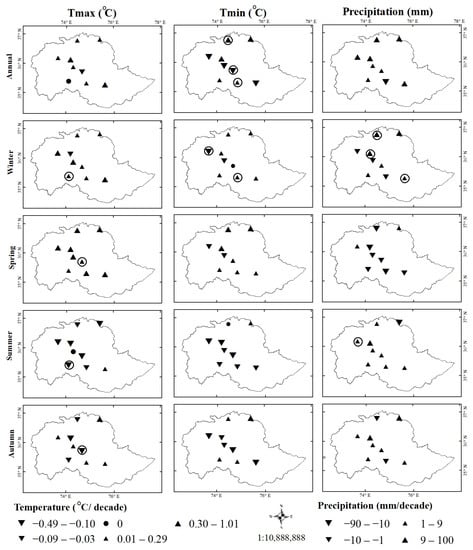 Spatial distribution of stations with Mann-Kendall and Sen’s test for annual and seasonal Tmax, Tmin and precipitation. Black circles indicate significance level at 5%.