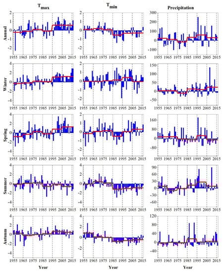 Change point analysis in annual and seasonal Tmax, Tmin (°C/decade) and precipitation (mm/decade) during 1955–2016.
