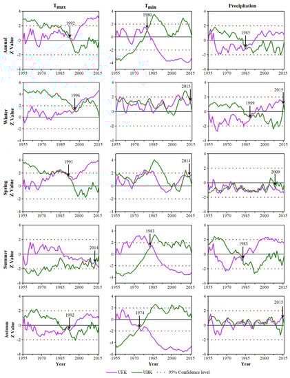 The SQMK analysis provides a detailed picture for start of trend, abrupt changes and significant trends as presented in Figure 6. The intersection of a forward (UFK) and backward (UBK) line represents a significant change point. The major significant change points are marked with an arrow. In general, 1955–1995 is the period where the trends in the annual and seasonal Tmax are decreasing, however, increasing afterwards except a constant decrease in summer during 1955–2016.