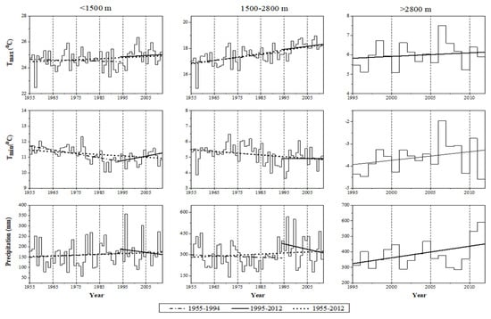 The elevation dependency of climatic warming was found in many previous studies [,,,]. To further investigate the impacts of elevation variation on climate, the trends of annual Tmax, Tmin and precipitation in different elevations (<1500 m, 1500–2800 m, >2800 m) are computed (Figure 7). Warming in Tmax is more pronounced since the mid-1990s, the variations during three time periods (1955–1994, 1995–2012 and 1955–2012) are also analyzed for more details. Compared to regions with altitudes <1500 m, the regional trends for Tmax, Tmin and precipitation were greater in regions with elevation of 1500–2800 m at the trends of 0.25 °C/decade, −0.12 °C/decade and 6.84 mm/decade during 1955–2012 (Figure 7). During 1955–1994, Tmax increased, while precipitation decreased at <2800 m (Figure 7). In addition, the impacts of elevation variation on precipitation were more distinct during 1995–2012. Precipitation decreased in regions with altitudes <2800 m, and increased in higher elevation (>2800 m). Overall, the effects of elevation variation on climate are obvious. Temperature and precipitation in the UIB exhibit obvious changes in different phases. As shown in Figure 7, the regional trends for Tmin were negative during 1955–2012 in <1500 m. However, clear warming trends of 0.20 and 0.48 °C/decade are observed for Tmin during 1995–2012 in <1500 m and >2800 m.