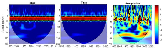 Continuous wavelet transform (CWT) of Tmax, Tmin and precipitation time series during 1955–2016. Thick contours denote 5% significance levels against red noise.