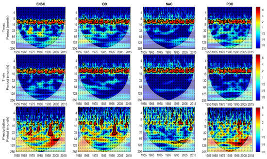 Cross wavelet transform (XWT) of Tmax, Tmin and precipitation with ENSO, IOD, NAO and PDO during 1955–2016. Right-pointing arrows indicate that the two signals are in phase, while left is for anti-phase signals. Thick contours denote 5% significance levels against red noise.