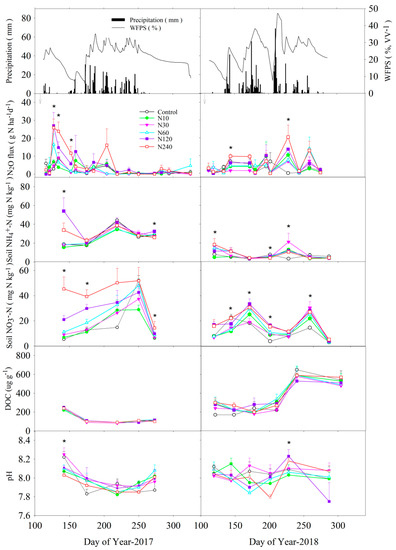 Daily soil N2O flux rate, soil concentrations of NO3−-N, NH4+-N, and dissolved organic carbon (DOC), and pH as affected by N addition treatments, and daily precipitation, and WFPS at 5 cm soil depth in 2017 and 2018. * indicates significant treatment effect at p < 0.05. Arrows indicate the dates of N addition.