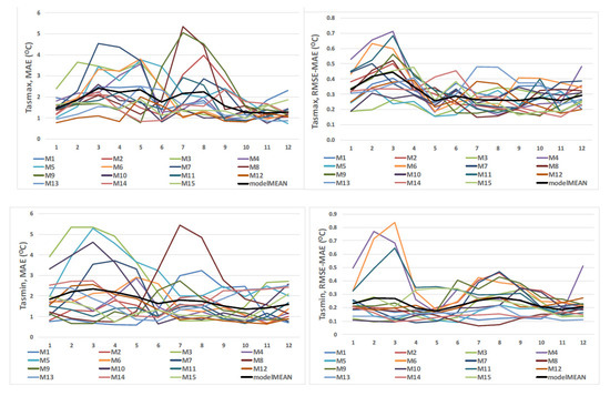 The validation metrics for individual models over the 12 months are presented in Figure 2, and the detailed results are included in Supplementary Material as Table S1. The multimodel mean of MAE is 1.3 °C for tasmax and 1.5 °C for tasmin (Table 1). However, there is a wide spread among the models (upper left and bottom left graphs in Figure 2), mainly during the spring and summer. The most significant mean errors are detected for M5, M3, and M7. The difference between RMSE and MAE highlights outliers in errors (in RMSE, the errors are squared before averaging). Larger outliers are detected in January, February, and March, particularly M4, M6, and M11 simulations (upper right and bottom right graphs in Figure 2).