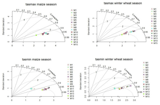 Validation of tasmax and tasmin for 15 EURO-CORDEX simulations against ROCADA observation-derived datasets over the period 1971–2000 (full names of the individual model are given in Table 1) for vegetation periods of maize (April–October) and winter wheat (October–June). In the diagram, the circle on the Ox-axis represents the observation, and the colored plots represent the different models. Three statistics determine the relative places of the models: the Pearson correlation coefficient (curved axes), the centered RMS error (grey contours), and the standard deviation (Oy-axis). The model fitting best with observations will lie the nearest to the Ox-axis.