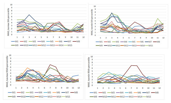 MAE and RMSE of the 5th and 95th percentiles were calculated to analyze the performance of the models in representing extreme values. Figure 4 depicts the spread of the models in terms of MAE by months. The larger errors were detected for the 5th percentile for tasmin. M3, M7, and M5 simulations indicated the most significant errors in representing low temperature (upper right graph in Figure 4). The spread among the models in the case of high extremes is smaller. Some outliers are also present, namely, M8 and M9 (lower graphs in Figure 4).