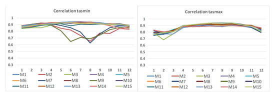 The spatial correlation was determined between modeled and observation-derived gridded values. Figure 5 presents the correlation coefficients over the 12 months for tasmin (left) and tasmax (right). A strong correlation was detected for annual mean values for both parameters (Table 2), but during the summer, three models revealed a weak correlation in tasmin (M9, M2, and M7).