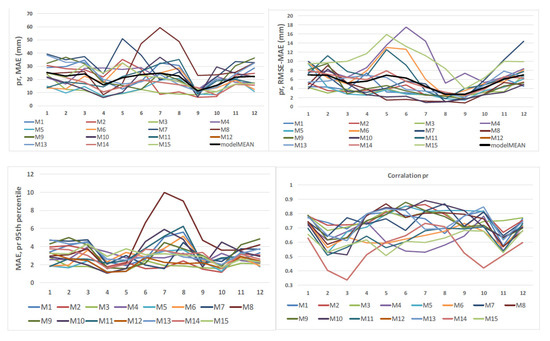 The validation metrics for the 15 RCMs are given in Figure 6, and the detailed results are presented in the Supplementary Material, Table S1. The multimodel mean of MAE is 144.1 mm (Table 2). There is a wide spread among the models over the year (upper left graph in Figure 6). The largest monthly MAEs are detected in the case of M7 and M8. The difference between RMSE and MAE highlights outliers in errors, especially in the summertime, particularly for the M4, M15, and M6 simulations (upper left graph in Figure 6). The monthly 95th percentiles were compared between modeled values and observation-derived data (lower left chart in Figure 6). Among the models, M8 seems to be an outlier.
