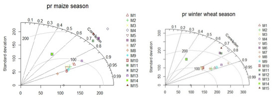 Validation of pr in 15 EURO-CORDEX simulations against ROCADA observation-derived data, over the period 1971–2000 (full names of individual models are given in Table 1) for vegetation periods of maize (April–October) and winter wheat (October–June). In the diagram, the circle on Ox-axis represents the observation, and the colored plots represent the different models. Three statistics determine the relative places of the models: the Pearson correlation coefficient (curved axes), the centered RMS error (grey contours), and the standard deviation (Oy-axis). The model best fitting with observations will lie the nearest to the Ox-axis.