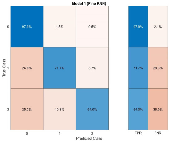 We evaluated the performance of the presented model using the cross-validation method in the Classification Learner Application in MATLAB. The cross-validation method partitions the data into disjoint folds and for each fold trains the model using in-fold data and calculates the average test error over all of the defined folds. The cross-validation method protects against overfitting by partitioning the data set into folds and estimating accuracy on each fold. Figure 1 provides the accuracy of each class based on the 5-fold cross-validation using the confusion matrix. Additionally, we presented the confusion matrix of 10-fold and 15-fold in Figures S1 and S2, Supplementary Materials. We also calculated the accuracy of the model based on the holdout validation and selected 25% of the data to use as a test set. The results from the holdout validation are also provided in Figure S3.