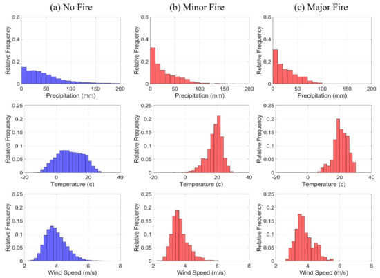 Relative frequency of monthly precipitation, temperature, and wind speed for months (a) without fire, (b) minor fire, and (c) major fire over the historical period (1986–2015).