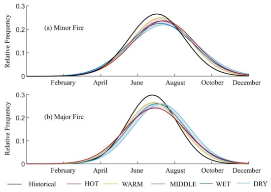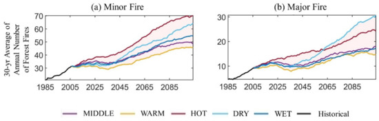 Natural wildfires in western national forests are highly seasonal, with most fires occurring between May and October over the historical period (1986–2015) (Figure 9). However, an increase in temperature combined with shifts in the monthly distribution of precipitation can alter forest fire seasons. Figure 9 compares the monthly rate of minor and major forest fires under historical and future climate conditions by assuming that the monthly distribution of fire events follows a normal distribution. The results indicate that historical natural-caused forest fires highly occurred over summer months with the highest rate in July. However, the distributions of future natural-caused forest fires under all five climate scenarios shift to the right and have ticker tails compared to the distribution of historical forest fires indicating that, although the natural-caused forest fires still have the highest rate of occurrence over the summer months in the future (2070–2099), they will also be likely to occur over fall and even winter months in the future with a higher rate compared to the historical conditions.