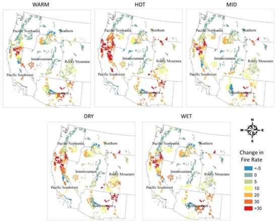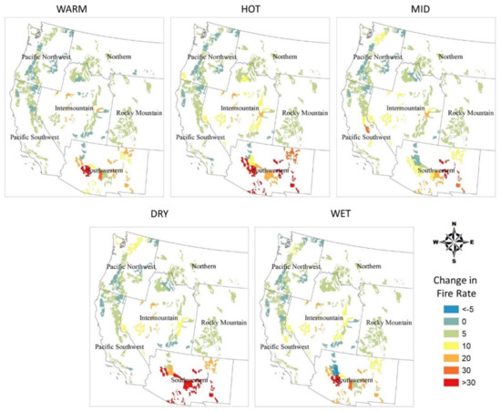The fire prediction model was used to predict future natural-caused fire activity in western United States national forests based on results from WARM (lowest increase in temperature), WET (highest increase in precipitation), DRY (highest decrease in precipitation), HOT (highest increase in temperature), and MID GCMs. These scenarios have been selected according to average changes in precipitation and temperature for the United States [46]. The use of these five climate change scenarios allows us to project a range of future fire activity for each Forest Service region [8].