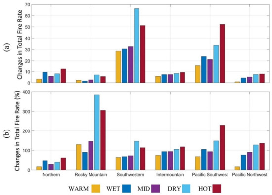 (a) Absolute changes in total fire rate and (b) percentage changes on total fire rate of United States Forest Service regions from historical (1986–2015) to future conditions (2070–2099).