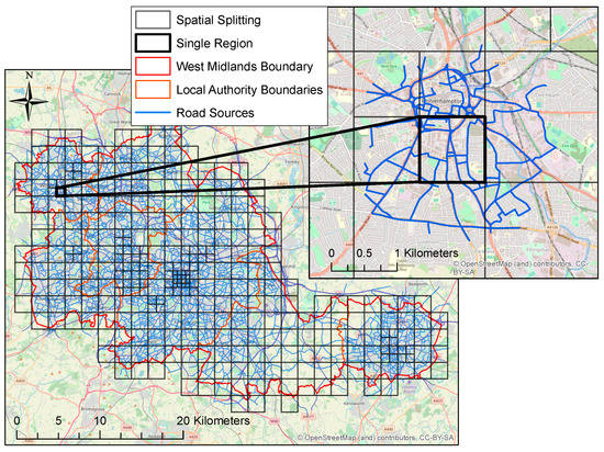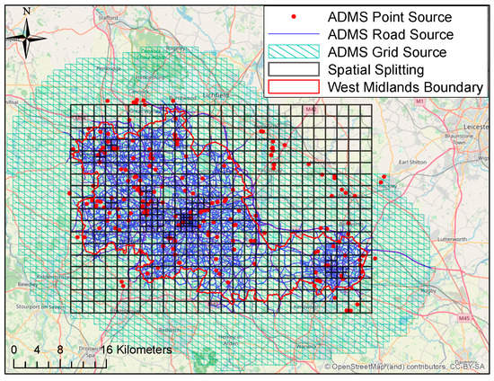 The task farming approach was achieved by spatially splitting the domain within the ADMS model. The overall rectangular output grid domain extent covering WM was first divided into 468 smaller sub-domains (forming a grid of 26 by 18 sub-domains, shown as Figure 2), each with a size of 2 km × 2 km. For some 2 km × 2 km subdomains with denser road links in city centre areas, which also included increased numbers of output points to fully resolve the near-road concentrations, a further spatial splitting into 1 km × 1 km or 500 m × 500 m was adopted in order to reduce the overall computation time. The total number of sub-domains was 540 (although no output points have been specified beyond 1 km outside the WM boundaries). The maximum number of road sources in a single sub-domain was 598 and the maximum number of output points in a domain was 4725. A buffer zone [73] of 750 m for road sources (to exclude explicit road sources unlikely to contribute significantly to modelled concentrations in the sub-domain) was used for each sub-domain.