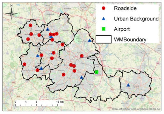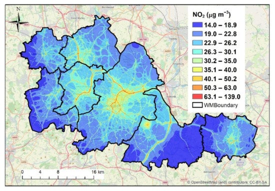 The authors appreciate the University of Birmingham’s BlueBEAR HPC service (http://www.bear.bham.ac.uk, accessed on 23 April 2021) for providing the computational resource. The authors would like to acknowledge local authorities within WM for provision of local air quality measurement and modelling data and for their review of local emissions data, with special thanks to John Grant and Curtis Dean in Walsall council. The authors also thank Transport for West Midlands (TfWM) and Birmingham City Council for provision of traffic data, previous modelling and reports.
