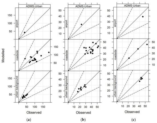 Comparison of annual averages between model output and measurement: (a) for NOx (in μg m−3), (b) for NO2 (in μg m−3) and (c) for O3 (in μg m−3).