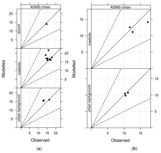 Figure 5 shows the evaluation of modelled annual average PM10 and PM2.5 against observations using scatter plots divided by site types; note that there were no PM2.5 measurements at the single airport site. PM10 had a very good fit for the airport and urban background sites. PM10 tended to slightly over-predict at roadside sites, possibly related to uncertainties in traffic non-exhaust emissions and background data. The model had good predictions for the small number of sites with available PM2.5 measurement data. For PM10 and PM2.5, Fb ranges between (−0.13, 0.12), slightly wider than (−0.07, 0.09) in Hood et al. (2018) [49]. Fac2 indicates that more than 74% of PM10 and PM2.5 are within a factor of 2 of observations. NMSE varies between (0.43, 0.53) for PM10 and PM2.5, slightly higher than (0.27, 0.37) in Hood et al. (2018) [49]. R varies between (0.48, 0.66) for PM10 and PM2.5, slightly lower than (0.58, 0.77) in Hood et al. (2018) [49].