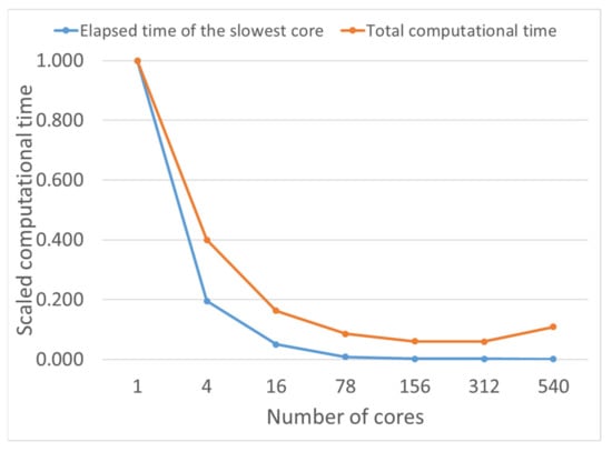 Comparison of elapsed (clock) time of the slowest core and total computational time using task farming; note that the horizontal axis scale is non-linear.