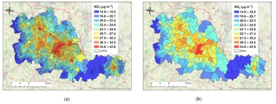For the purposes of health-related research, including assessment of personal exposure and exploration of relationships between air pollution levels and socio-demographic characteristics typically available on different spatial scales, the 10 m × 10 m horizontal resolution annual air quality map may need to be further aggregated into other polygon layers, e.g., Lower Layer Super Output Areas (LSOA) and ward levels (averages over these layers). Figure 8 shows examples of projected annual air quality maps for NO2 averaged over LSOA layer and ward level layer. There were clear patterns of higher concentration in city centre areas and lower concentration in rural areas. The projected air quality maps for other pollutants such as NOx, O3, PM10 and PM2.5 are shown in Figure A2 (in LSOA layer) and Figure A3 (in the ward layer). These can then be linked to population and health data for the assessment of the health impacts of air pollution. Note that the spatial averaging process leads to a narrower range of concentrations across the whole area, as both the lowest concentrations in the most rural areas and the highest concentrations adjacent to road sources are no longer fully represented; this reduction in dynamic range is significant and dependent on spatial resolution.