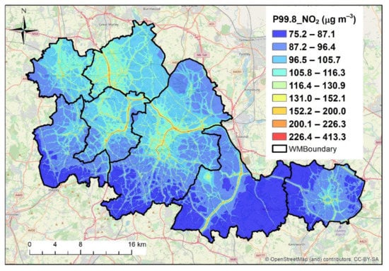 The high horizontal resolution air quality maps generated from the model output can be further aggregated into other health-related layers (such as LSOA and ward layers) to study the relationship between air quality and health data. Apart from the annual averages, the model output and post-processing flexibility enables the calculation of other statistics, such as percentiles. Exceedances of the air quality objective value for the 99.8 percentile of the 1 h mean NO2 concentration were generally only found for motorways and major roads directing to motorways, which is unsurprising due to intensive traffic activity. The reduction in traffic speed limits for some motorways (e.g., trials on speed limits on M6 and M5 motorways near Birmingham reduced from 70 mph to 60 mph by Highways England [76]) may thus help to reduce the NO2 exceedance, although exposure at such locations may be limited.