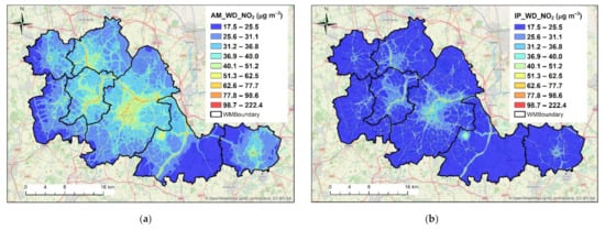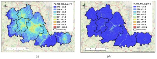 Air quality maps over temporal subsets can be also derived for health/exposure study. As expected, AM weekday and PM weekday have clear patterns of region-wide traffic, while NO2 concentrations over these periods are much higher than the annual averages. The influences of traffic over IP weekday and IP weekend are less significant compared with AM weekday and PM weekday. These findings can be useful for exposure and health studies over working periods. Reis et al. [77] also highlighted the importance of workday population mobility on the exposure to air pollutants.